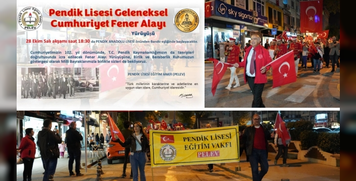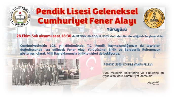 Cumhuriyetimizin 102. yılı dolayısıyla, Pendik Lisesi Eğitim Vakfı (PELEV) tarafından organize edilen Geleneksel Cumhuriyet Fener Alayı Yürüyüşü, bu yıl da büyük bir coşkuyla gerçekleştirilecek.