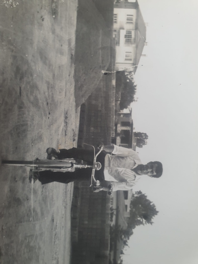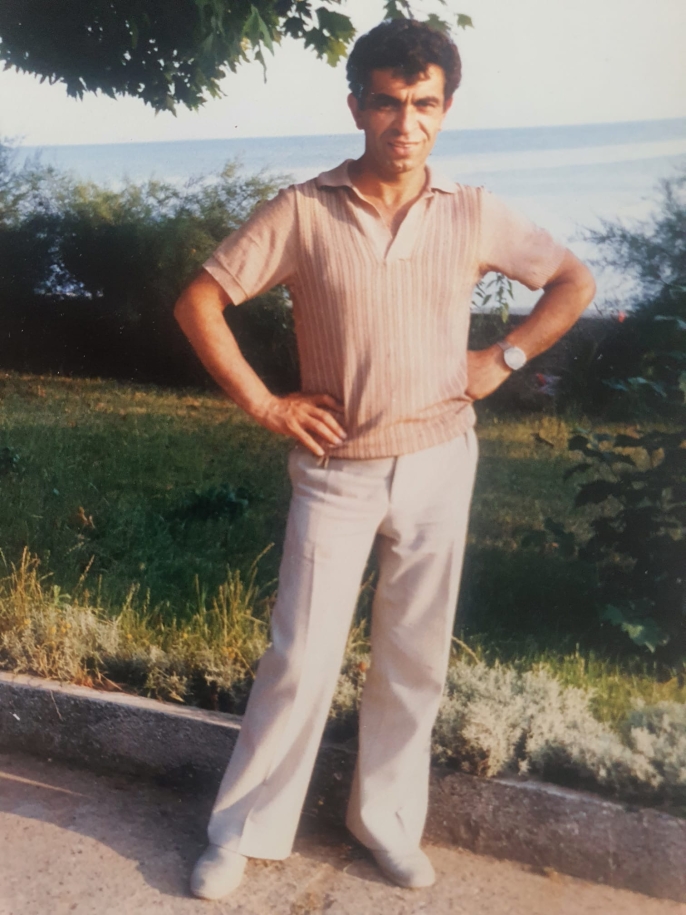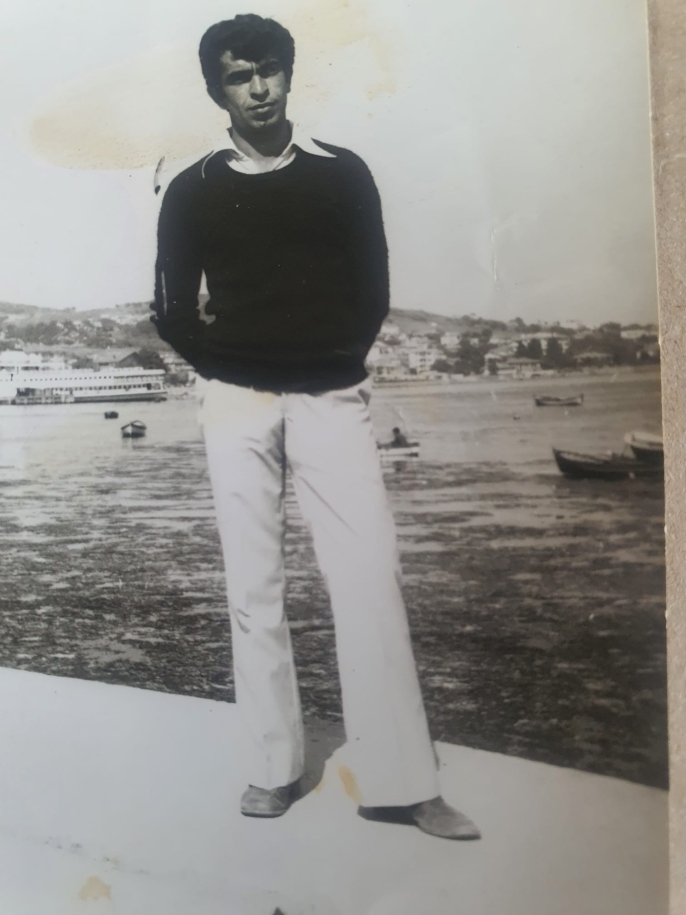 Bir karede Münir İçin, arkasında eski vapur iskelesiyle duruyor;