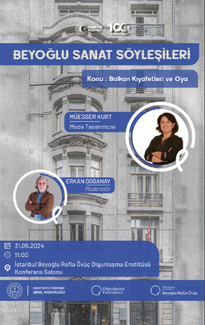 Pendikli Moda Tasarımcısı Müesser Kurt, İstanbul Beyoğlu Refia Övüç Olgunlaşma Enstitüsü konferans salonunda, 31 Mayıs Cuma günü saat 11.00’de ‘Balkan Kıyafetleri ve Oya’ konulu bir söyleşi gerçekleştirecek. Beyoğlu Sanat Söyleşileri konulu programın moderatörlüğünü Erkan Doğanay yapacak. Söyleşiye herkes davetlidir.