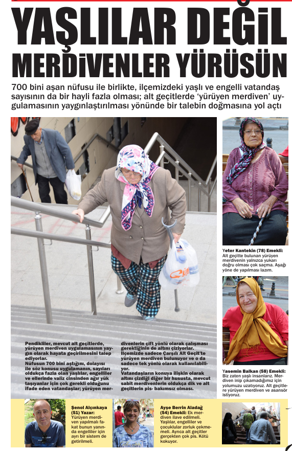 Yeter Kantekin (78) Emekli: Alt geçitte bulunan yürüyen merdivenin yalnızca yukarı doğru olması çok saçma. Aşağı yöne de yapılması lazım.