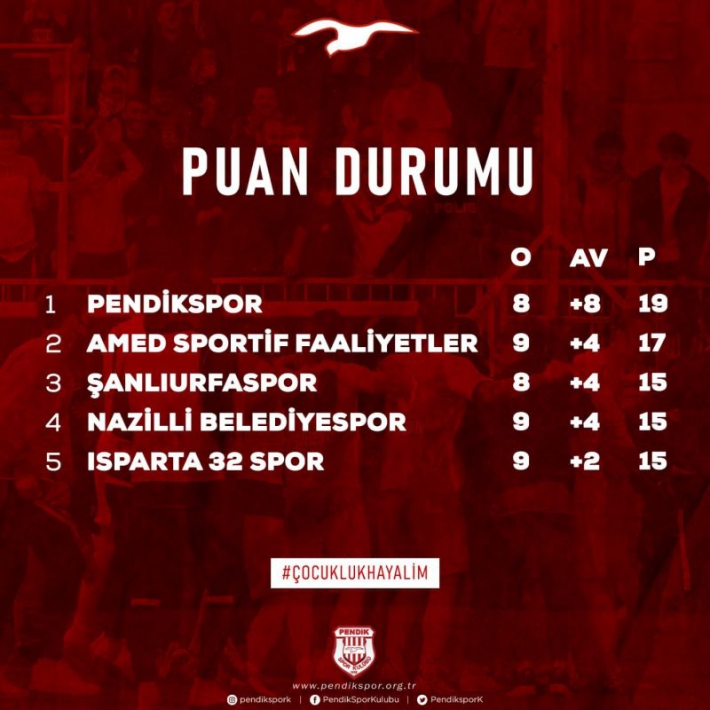 19 puanla ligin en üst sırasında bulunan Pendikspor’u 17 puanla Amed, 15 puanla Şanlıurfa, Nazilli Belediye ve Isparta 32 takımları takip ediyor. Her maçın önem kazandığı, her puanın altın değerinde olduğu ligde Pendikspor neler yapacak hep birlikte göreceğiz.