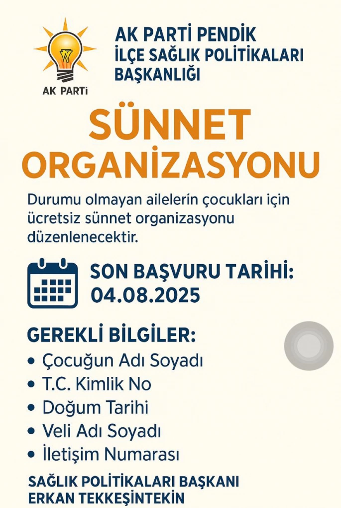 Konuyla ilgili açıklamada bulunan AK Parti Pendik İlçe Sağlık Politikaları Başkanı Erkan Tekkeşintekin, “Bu organizasyonla, çocuklarımızın sağlıklı bir şekilde sünnet olmasını sağlarken aynı zamanda aile bütçelerine katkı sunmak istiyoruz.” dedi.