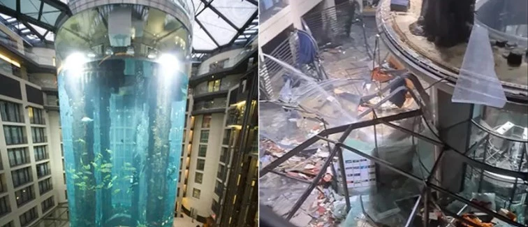 Başkent Berlin’de egzotik balıklara ev sahipliği yapan AquaDom isimli akvaryumun patlaması ile 1 milyon litre su yollara aktı.