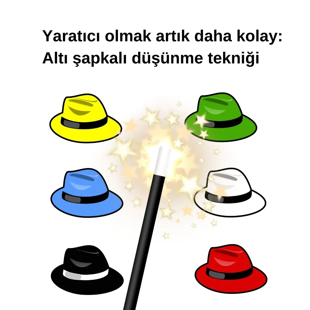 Dr. Edward De Bono tarafından ortaya çıkarılmış olan altı şapkalı düşünme tekniği, kişinin nasıl yaratıcı fikirler ortaya çıkarabileceğine dair olanak sağlar. Böylece yeni fikirler ortaya çıkarmak ile beraber, sıfırdan farklı konular eşliğinde hayal gücünü geniş biçimde kullanma olanağı verir. Böylece bu altı şapka değişik renkler üzerinden ele alınmak suretiyle kullanarak yeni fikirler üretim noktasında güçlü hale gelinir.