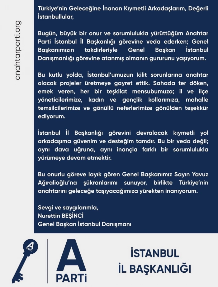 Pendikli bir isim olan İş İnsanı ve Siyasetçi Nurettin Beşinci, İstanbul İl Başkanı olarak yürüttüğü görevini Genel Başkan İstanbul Danışmanı olması sebebiyle bıraktı. Beşinci, partililere bir teşekkür metni ile seslendi.
