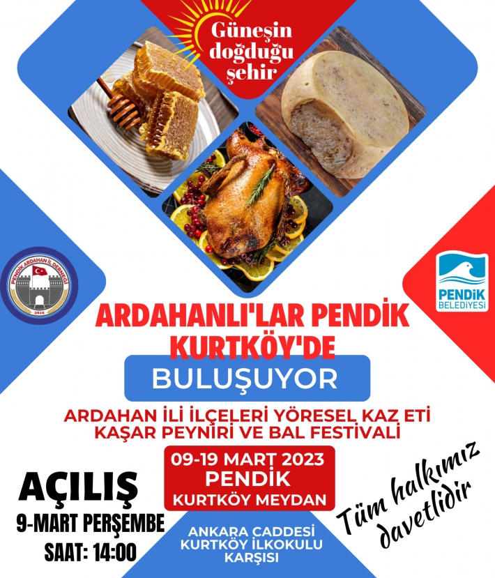 Ardahan ili ve ilçelerinin kültürel lezzetleri ile gerçekleşecek tanıtım festivali, 9 Mart Perşembe günü saat 14:00’de Pendik Kurtköy Meydanında Ardahanlıları Pendik’te buluşturacak.