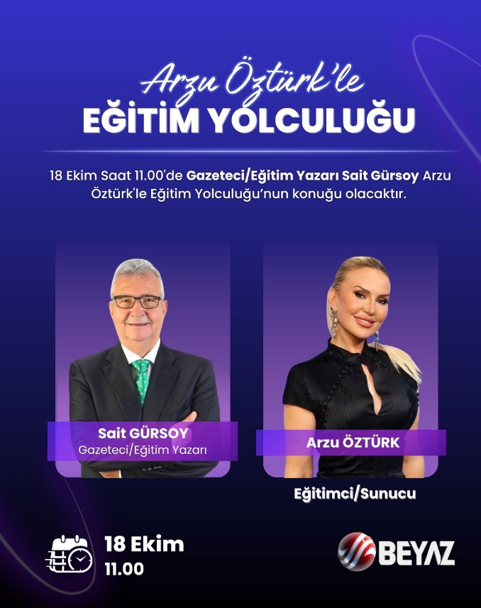 Eğitimci ve sunucu Arzu Öztürk’ün hazırlayıp sunduğu “Arzu Öztürk’le Eğitim Yolculuğu” programı, 18 Ekim Cumartesi günü saat 11.00’de Beyaz TV ekranlarında izleyicilerle buluşacak.