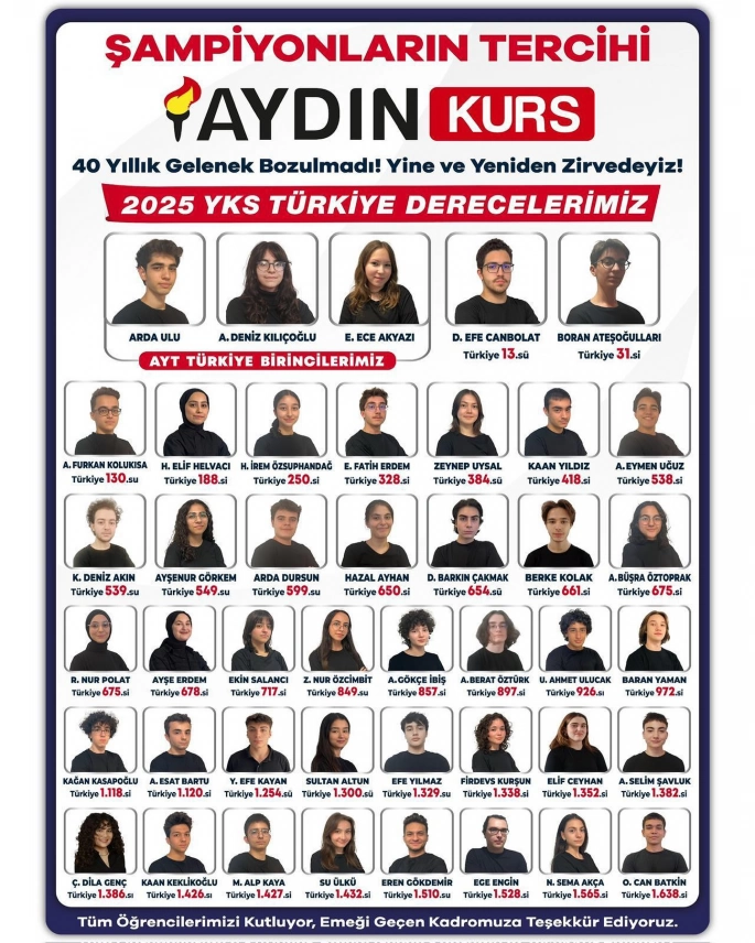 Aydın Kurs öğrencilerinden Arda Ulu, A. Deniz Kılıçoğlu ve Ece Akyazı AYT Türkiye birincileri arasında yer aldı. D. Efe Canbolat Türkiye 13.’sü, Boran Ateşoğulları ise Türkiye 31.’si olarak önemli dereceler elde etti. Bunun yanı sıra Türkiye genelinde ilk 1000’e giren çok sayıda öğrenci, kurumun disiplinli ve özverili eğitim anlayışını bir kez daha kanıtladı.