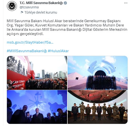 Milli Savunma Bakanı Hulusi Akar beraberinde Genelkurmay Lideri Org. Yaşar Güler, Kuvvet Kumandanları ve Bakan Yardımcısı Muhsin Dere ile Ankara’da kurulan Ulusal Savunma Bakanlığı Dijital Gösterim Merkezi’nin açılışını gerçekleştirdi.