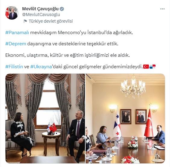 Bakan Çavuşoğlu, toplumsal medya hesabından görüşmeye ait yaptığı açıklamada, “Panamalı mevkidaşım Mencomo’yu İstanbul’da ağırladık. Deprem dayanışma ve takviyelerine teşekkür ettik. İktisat, ulaştırma, kültür ve eğitim işbirliğimizi ele aldık. Filistin ve Ukrayna’daki yeni gelişmeler gündemimizdeydi.” sözlerine yer verdi.