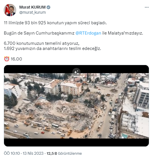 Bakan Kurum Twitter hesabından yaptığı açıklamada, “11 ilimizde 93 bin 925 konutun yapım süreci başladı. Bugün de Sayın Cumhurbaşkanımız Recep Tayyip Erdoğan ile Malatyamızdayız. 6 bin 700 konutumuzun temelini atıyoruz, bin 692 yuvamızın da anahtarlarını teslim edeceğiz.” tabirini kullandı.
