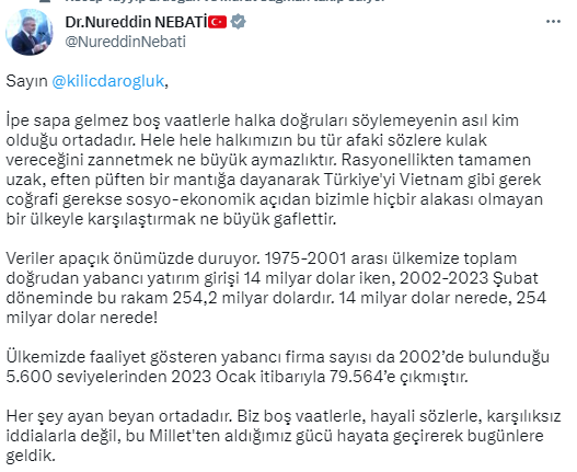 Rasyonellikten büsbütün uzak, eften püften bir mantığa dayanarak Türkiye'yi Vietnam üzere gerek coğrafik gerekse sosyo-ekonomik açıdan bizimle hiçbir alakası olmayan bir ülkeyle karşılaştırmak ne büyük gaflettir. Bilgiler apaçık önümüzde duruyor. 1975-2001 ortası ülkemize toplam direkt yabancı yatırım girişi 14 milyar dolar iken, 2002-2023 Şubat devrinde bu sayı 254,2 milyar dolardır. 14 milyar dolar nerede, 254 milyar dolar nerede! Ülkemizde faaliyet gösteren yabancı firma sayısı da 2002’de bulunduğu 5.600 düzeylerinden 2023 Ocak prestijiyle 79.564’e çıkmıştır. Her şey ayan beyan ortadadır. Biz boş vaatlerle, hayali sözlerle, karşılıksız tezlerle değil, bu milletten aldığımız gücü hayata geçirerek bugünlere geldik.” tabirini kullandı.