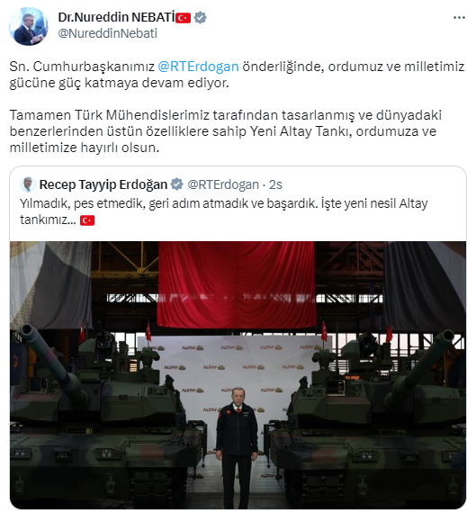 “Sn. Cumhurbaşkanımız Recep Tayyip Erdoğan önderliğinde, ordumuz ve milletimiz gücüne güç katmaya devam ediyor. Tamamen Türk Mühendislerimiz tarafından tasarlanmış ve dünyadaki benzerlerinden üstün özelliklere sahip Yeni Altay Tankı, ordumuza ve milletimize hayırlı olsun.”