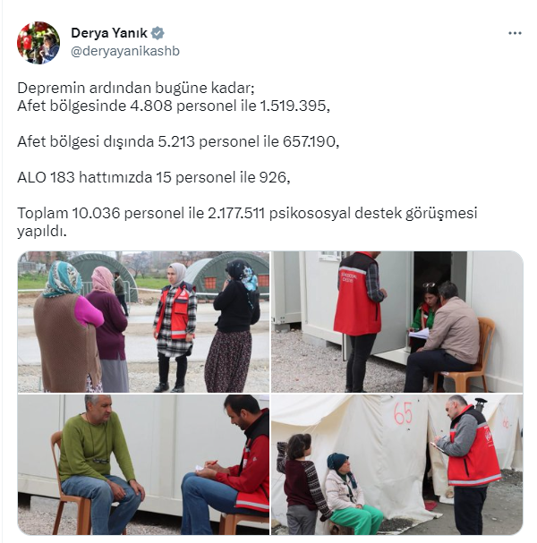 “Depremin ardından bugüne kadar; Afet bölgesinde 4 bin 808 personel ile 1 milyon 519 bin 395, afet bölgesi dışında 5 bin 213 personel ile 657 bin 190, ALO 183 hattımızda 15 personel ile 926, toplam 10 bin 36 personel ile 2 milyon 177 bin 511 psikososyal destek görüşmesi yapıldı.”