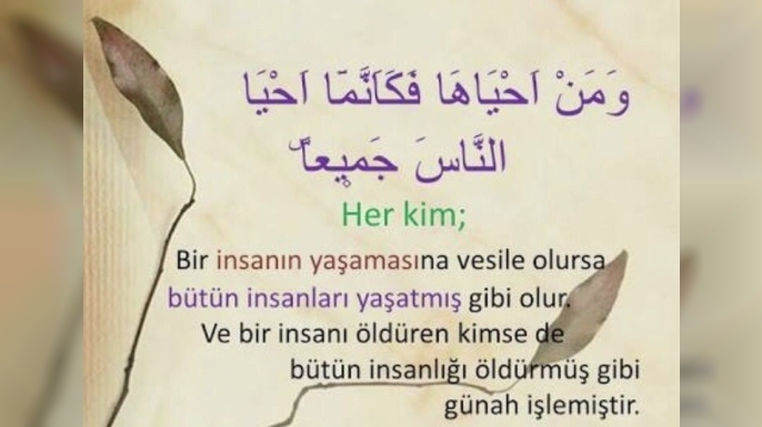 **Meal:** Bu sebeple İsrailoğullarına şöyle yazdık: Kim bir insanı –bir can karşılığı veya yeryüzünde bozgunculuk çıkarmak dışında– öldürürse bütün insanları öldürmüş gibi olur. Kim de bir can kurtarırsa bütün insanları kurtarmış gibi olur...