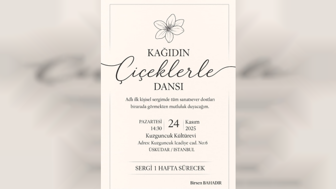 Kâğıt üzerinde çiçek temalı çalışmaların yer aldığı sergi, Kuzguncuk İcadiye Caddesi No:6 adresindeki kültürevinde ziyaret edilebilecek. Bahadır, duyurusunda tüm sanat dostlarını serginin açılışında bir arada görmekten mutluluk duyacağını belirtti.