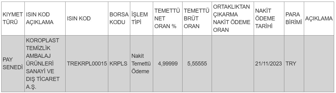 Kamuyu Aydınlatma Platformuna (KAP) yapılan açıklamaya nazaran, Merkezi Kaydi Sistemde ihraççı şirket bildirimleri doğrultusunda gerçekleştirilen hak kullanım ödemelerine ilişkin kayıtlar şöyle: