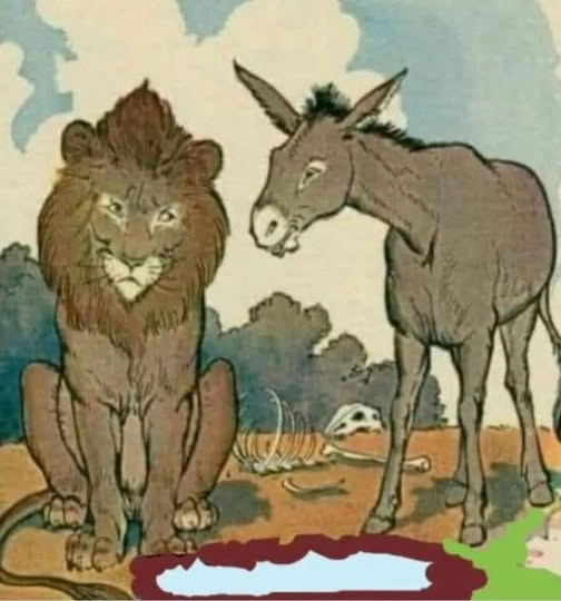 Aslanın tahtına oturduğu ormandaki açıklığa varmadan eşek bağırmaya başladı: "Majesteleri, çimlerin mavi olduğu doğru mu?"
