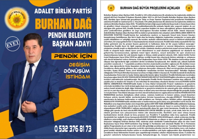 AB Parti Pendik Belediye Başkan Adayı Burhan Dağ, projelerini açıkladı.