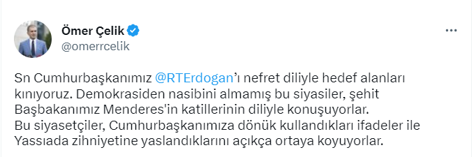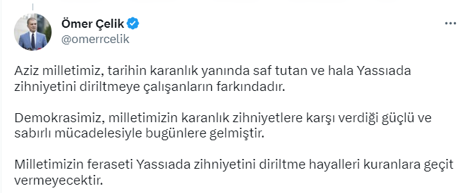 “Sayın Cumhurbaşkanımız Recep Tayyip Erdoğan’ı nefret lisanıyla gaye alanları kınıyoruz. Demokrasiden nasibini almamış bu politikler, şehit Başbakanımız Menderes'in katillerinin lisanıyla konuşuyor. Bu siyasetçiler, Cumhurbaşkanımıza dönük kullandıkları tabirler ile Yassıada zihniyetine yaslandıklarını açıkça ortaya koyuyor. Aziz milletimiz, tarihin karanlık yanında saf tutan ve hala Yassıada zihniyetini diriltmeye çalışanların farkındadır. Demokrasimiz, milletimizin karanlık zihniyetlere karşı verdiği güçlü ve sabırlı uğraşıyla bugünlere gelmiştir. Milletimizin feraseti Yassıada zihniyetini diriltme hayalleri kuranlara geçit vermeyecektir. Demokratik kazanımlarımız gelecek kuşaklara bırakılacak en büyük mirastır. Karanlık odaklarla işbirliği yaparak demokrasimizi sakatlamaya, hukuk devletimizi yaralamaya ve seçilmiş makamları vesayet altına almaya çalışan bu zihniyete karşı demokrasi çabamızı vermeye devam edeceğiz.”