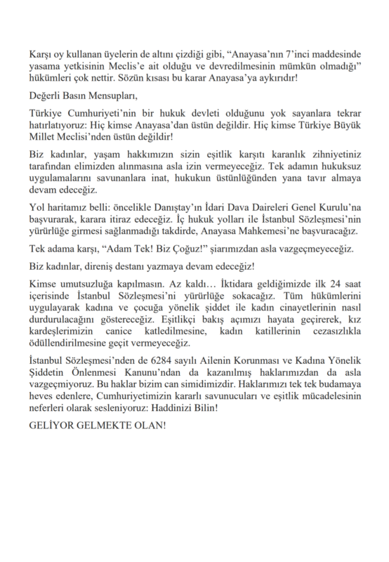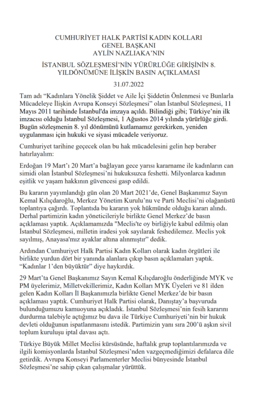 Cumhuriyet Halk Partisi Genel Başkanı Aylin Nazlıaka’nın İstanbul Sözleşmesi’nin yürürlüğe girmesinin 8. yıldönümüne ilişkin 81 il 973 ilçede eş zamanlı basın açıklaması gerçekleşti.