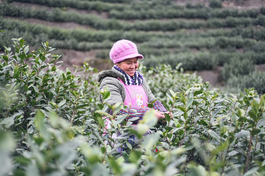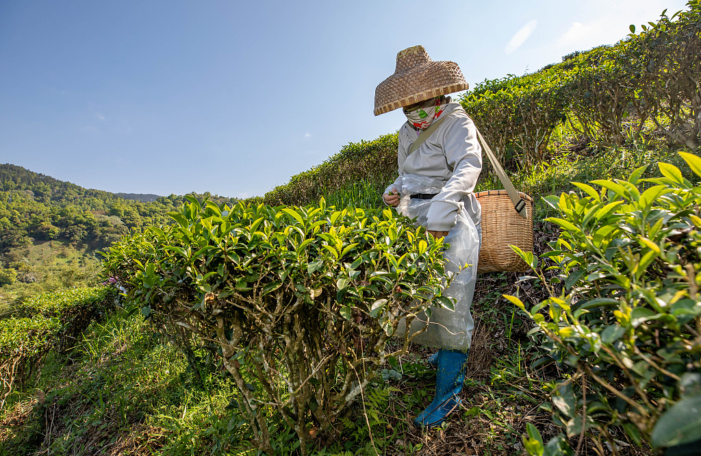 Çin’in güneybatısındaki Guizhou eyaletinin Qianxinan Buyi ve Miao Özerk İli’nde çay toplayan bir çiftçi