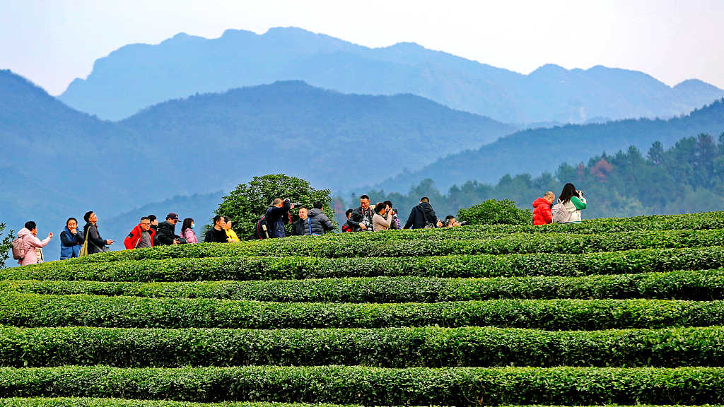 Çin’in güneybatısındaki Chongqing kentinde turistler çay tarlalarında görünüm seyrederek çay toplamayı deneyimliyor