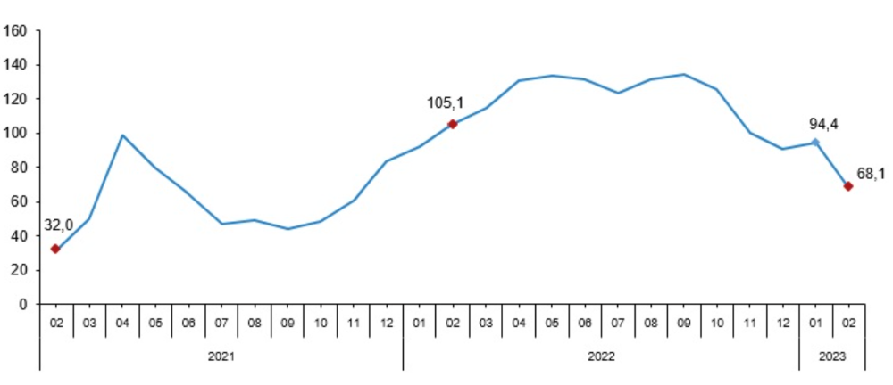 Sanayi, inşaat, ticaret ve hizmet dalları toplamında ciro endeksi (2015=100), 2023 yılı Şubat ayında yıllık %68,1 arttı.