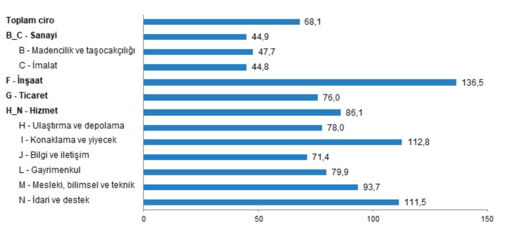 Toplam cironun alt ayrıntılarına bakıldığında; 2023 yılı Şubat ayında yıllık sanayi bölümü ciro endeksi %44,9, inşaat ciro endeksi %136,5, ticaret ciro endeksi %76,0, hizmet ciro endeksi %86,1 arttı.