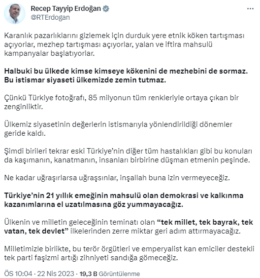 “Karanlık pazarlıklarını gizlemek için durduk yere etnik köken tartışması açıyorlar, mezhep tartışması açıyorlar, palavra ve iftira mahsulü kampanyalar başlatıyorlar. Halbuki bu ülkede kimse kimseye kökenini de mezhebini de sormaz.