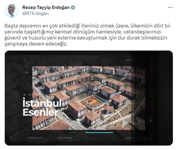 Cumhurbaşkanı Erdoğan, paylaşımında, “Başta depremin en çok etkilediği illerimiz olmak üzere, ülkemizin dört bir yanında başlattığımız kentsel dönüşüm hamlesiyle, vatandaşlarımızı güvenli ve huzurlu yeni evlerine kavuşturmak için dur durak bilmeksizin çalışmaya devam edeceğiz.” sözlerini kullandı.