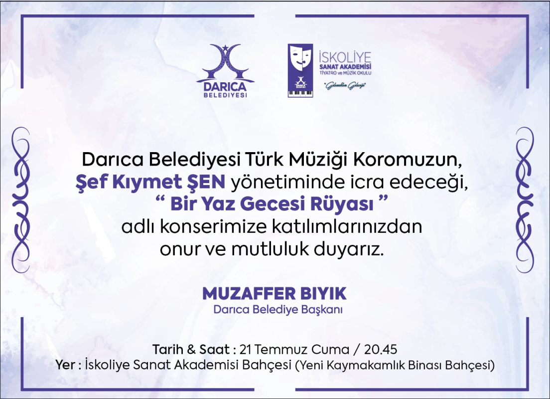 Çok yönlü aktiviteleri ile faaliyetlerini sürdüren Darıca Belediyesi Türk Müziği Korosu, 21 Temmuz Cuma akşamı saat 20.45’de İskoliye Sanat Akademisi Bahçesi’nde Şef Kıymet Şen yönetiminde “Bir Yaz Gecesi Rüyası” adlı yaz konserini gerçekleştirecek.