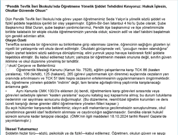 Bu açık hükümler karşısında beklentimiz; olayın adli makamlarca gecikmeksizin soruşturulması, okul yönetimince gerekli idarî tedbirlerin alınması ve caydırıcılığın sağlanmasıdır. Sendika olarak hukukî sürecin sonuna kadar takipçisi olacağız..”