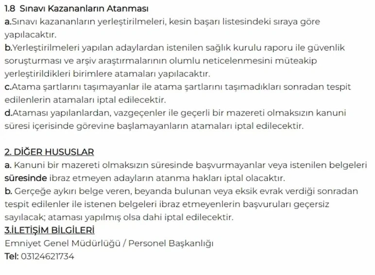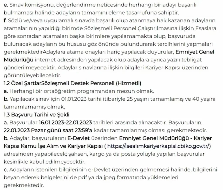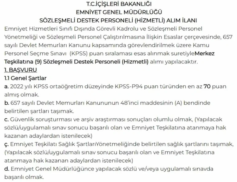 İçişleri Bakanlığı Emniyet Genel Müdürlüğü sözleşmeli 2023 yılı için personel alımı ilanı yayımlandı. EGM, 16-22 Ocak 2023 tarihleri arasında sözleşmeli personel alımını duyurdu. İlana göre en az lise mezunu öğrenim düzeyinden sözleşmeli personel alımı gerçekleşecek.