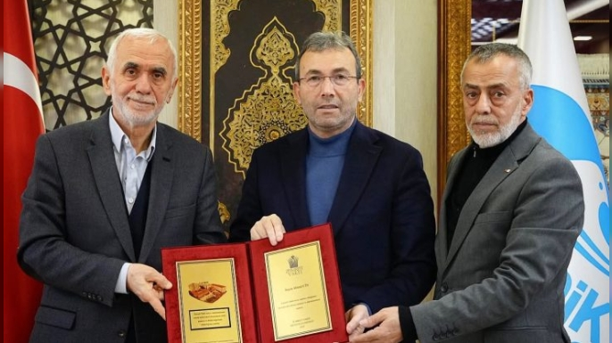 Cihat Aslanoğlu ile Erol Kaya, vakfa ve sosyal çalışmalara sunduğu katkılardan dolayı Başkan Ahmet Cin’e teşekkür plaketi takdim etti.
