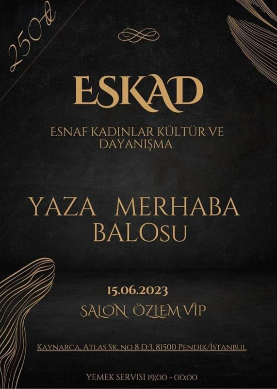 Yaklaşık 4 yıldır Pendik Esnaf ve Girişimci Kadınlar destek platformu olarak faaliyetlerini sürdüren Esnaf Kadınlar Kültür Ve Dayanışma Derneği (ESKAD), 15 Haziran Perşembe akşamı Kaynarca Özlem VIP Salonunda akşam saat 19.00’da ‘Yaza Merhaba’ balosu gerçekleştirecek.