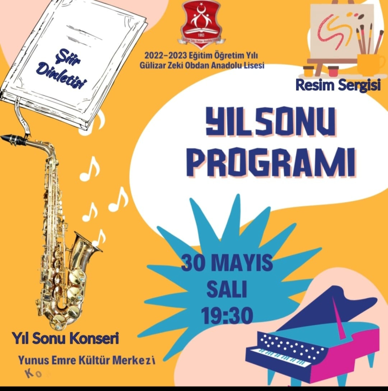Gülizar Zeki Obdan Anadolu Lisesi Yıl Sonu Programı 30 Mayıs akşamı saat 19.30’da Yunus Emre Kültür Merkezi’nde gerçekleştirilecek.