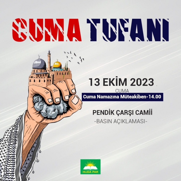 Hür Dava Partisi (HÜDAPAR) 13 Ekim Cuma namazına müteakiben, Pendik Çarşı Camii’nde saat 14:00’da ‘Cuma Tufanı’ adıyla Filistin’e destek gösterilerine ülke çapında destek verilmesi adına basın açıklaması gerçekleştirecek.