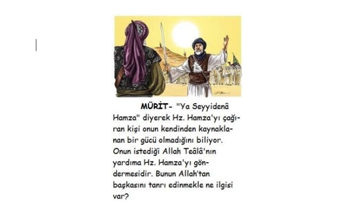MÜRİT- "Ya Seyyidenâ Hamza" diyerek Hz. Hamza'yı çağıran kişi onun kendinden kaynaklanan bir gücü olmadığını biliyor. Onun istediği Allah Teâlâ'nın yardıma Hz. Hamza'yı göndermesidir. Bunun Allah’tan başkasını tanrı edinmekle ne ilgisi var?