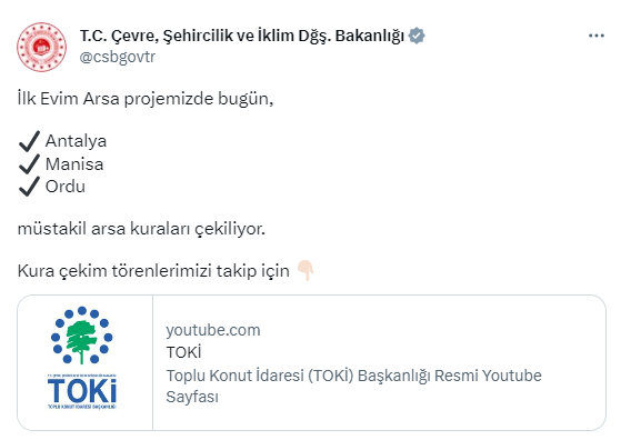 Bakanlığın toplumsal medya hesabından yapılan açıklamada, “İlk Konutum Arsa projemizde bugün, Antalya, Manisa, Ordu müstakil arsa kuraları çekiliyor.” denildi.