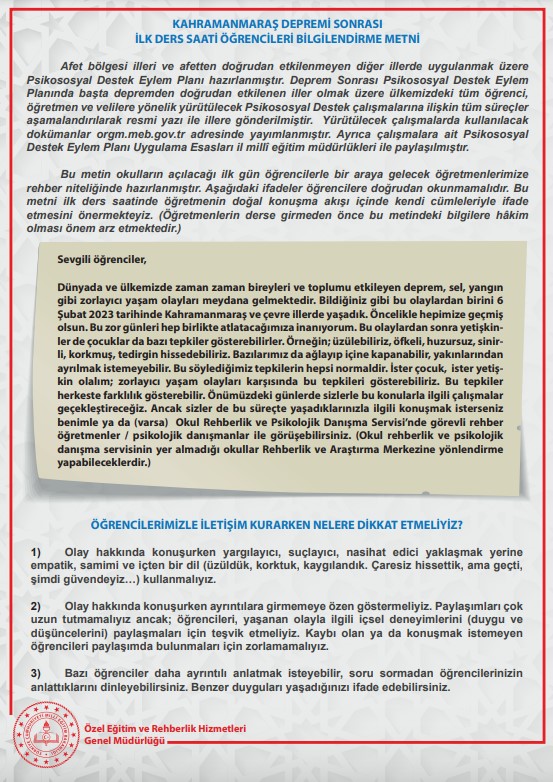 “Kahramanmaraş Depremi Sonrası İlk Ders Saati Öğrencileri Bilgilendirme Metni”