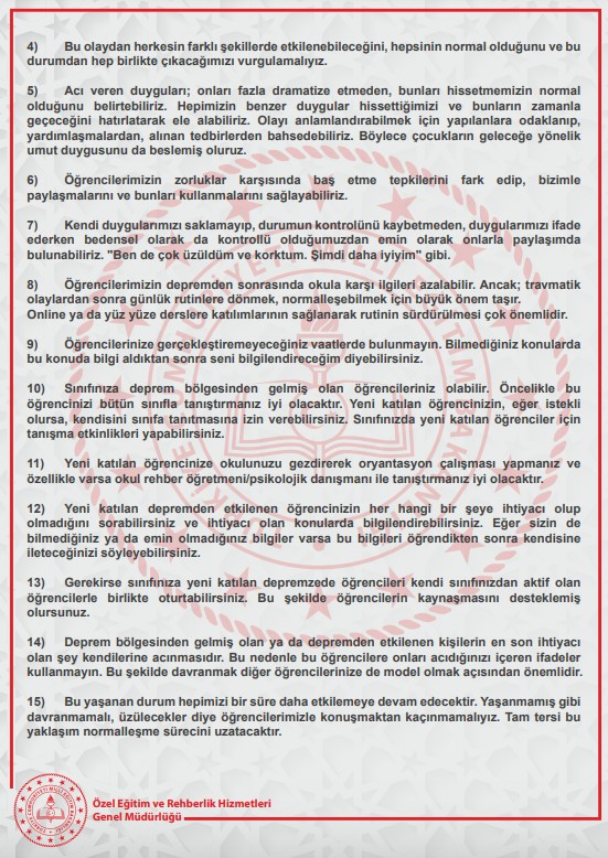 15) Bu yaşanan durum hepimizi bir süre daha etkilemeye devam edecektir. Yaşanmamış gibi davranmamalı, üzülecekler diye öğrencilerimizle konuşmaktan kaçınmamalıyız. Tam tersi bu yaklaşım normalleşme sürecini uzatacaktır.