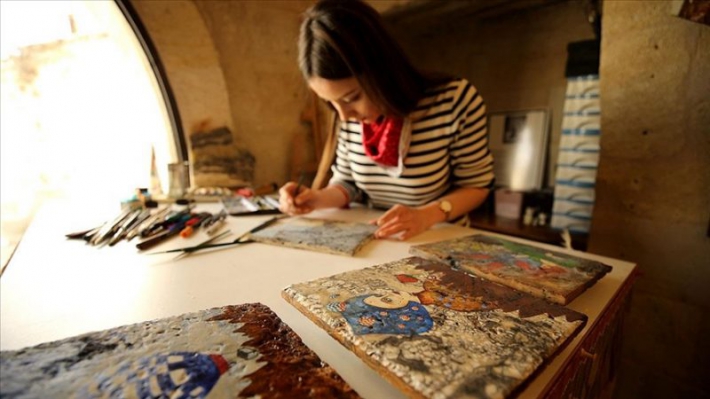 Nevşehir’in Göreme beldesinde yaşayan ressam Hatice Abalı, bölgeye özgü kayaçların üzerine hayalindeki peri kızlarını resmederek, ortaya birbirinden nadide sanat eserleri çıkarıyor.