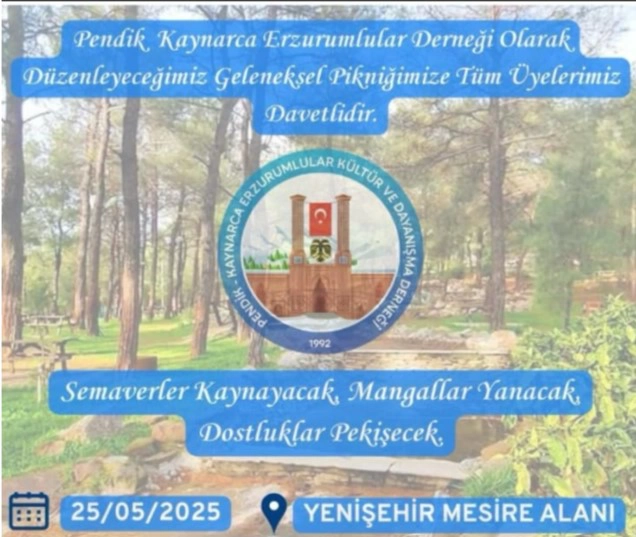 Başkanlığını Mehdi Kaya'nın yürüttüğü Pendik - Kaynarca Erzurumlular Kültür ve Dayanışma Derneği, geleneksel hale getirdiği piknik etkinliği dernek üyesi Adem Subaşı'nın vefatı sebebiyle ileri bir tarihe ertelendi. Kamuoyuna duyurulur.