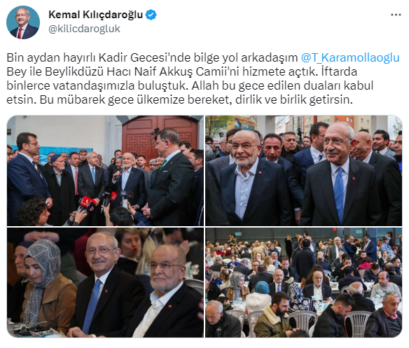 “Bin aydan hayırlı Kadir Gecesi'nde bilge yol arkadaşım Temel Karamollaoğlu Bey ile Beylikdüzü Hacı Naif Akkuş Camii'ni hizmete açtık. İftarda binlerce vatandaşımızla buluştuk. Allah bu gece edilen duaları kabul etsin. Bu mübarek gece ülkemize bereket, dirlik ve birlik getirsin.”