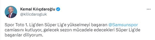 Kılıçdaroğlu, toplumsal medya hesabından yaptığı açıklamada, “Spor Toto 1. Lig'den Harika Lig'e yükselmeyi başaran Yılport Samsunspor topluluğunu kutluyor, gelecek dönem uğraş edecekleri Muhteşem Lig'de muvaffakiyetler diliyorum.” sözünü kullandı.