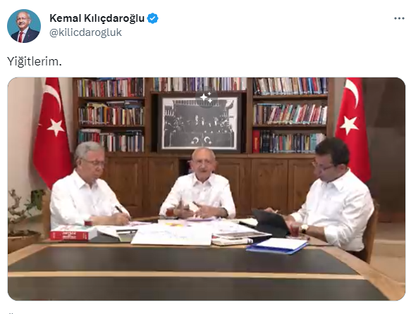 Millet İttifakı Cumhurbaşkanı adayı ve CHP Genel Lideri Kemal Kılıçdaroğlu, İstanbul Büyükşehir Belediye (İBB) Lideri Ekrem İmamoğlu ve Ankara Büyükşehir Belediye (ABB) Lideri Mansur Yavaş'la birlikte çektiği görüntüyü “Yiğitlerim” notuyla paylaştı.