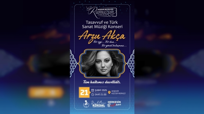 “Bir ezgi… Bir dua… Bir gönül buluşması…” temasıyla düzenlenecek konser, 21 Şubat 2026 Cumartesi günü saat 21.00’de Akşehir Kültür Merkezi’nde sanatseverlerle buluşacak. Ramazan ayının manevi atmosferine uygun seçkin eserlerin seslendirileceği gecede, Arzu Akça’nın tasavvuf müziği ve Türk sanat müziğinin nadide eserlerini yorumlaması bekleniyor.