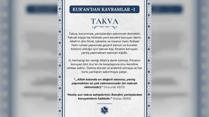 Takva, korunmak, yanlışlardan sakınmak demektir. Takvalı kişiye ise Müttaki yani kendini koruyan denir. Allah’ın dini fıtrat, tabiatta ve insanın hem fiziksel hem ruhsal yapısında geçerli kanun ve kurallar bütünü olduğu için takvalı kişi, fıtratını koruyan, yanlış yapmaktan sakınan kişidir.