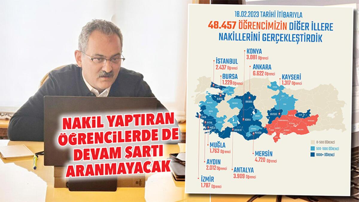Bakan Özer yaptığı paylaşımda, “Deprem bölgesinde 10 ilimizdeki öğrencilerimizin diğer illere nakilleriyle ilgili süreç kapsamında 48 bin 457 öğrencimizin nakil işlemini gerçekleştirdik. Bugün de aldığımız yeni bir kararla, deprem bölgesinden nakil olan öğrencilerimiz için devam şartı aramayacağız” dedi.